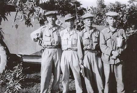 Đồng chí Cayxỏn Phômvihản (đầu tiên bên trái) cùng các cán bộ Quân đội Việt Nam tại Lào (Nguồn: Sách ảnh Quan hệ đặc biệt Việt Nam-Lào/Nhà xuất bản Thông tấn)
