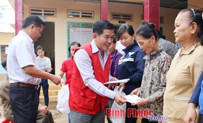 Chủ tịch Hội Chữ thập đỏ tỉnh Nguyễn Tấn Hưng tặng quà cho các hộ khó khăn ở xã Long Bình, huyện Phú Riềng