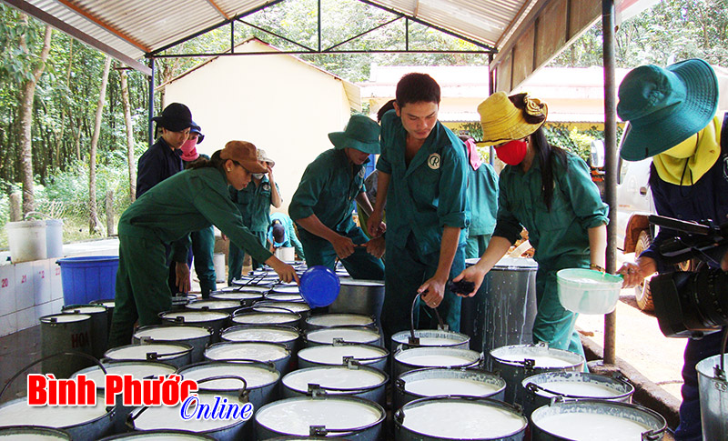 Công nhân cạo mủ (hầu hết là ĐVTN) Nông trường Minh Hưng giờ trút mủ