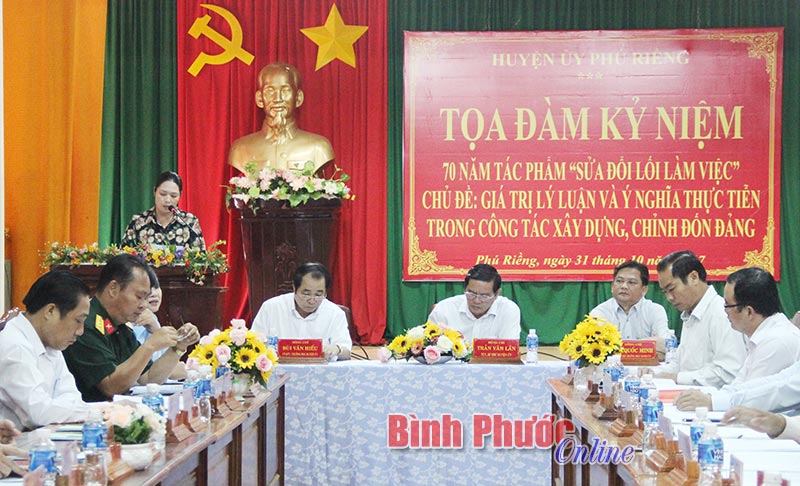 Đồng chí Trần Văn Lân, Tỉnh ủy viên, Bí thư Huyện ủy Phú Riềng cho rằng: Buổi tọa đàm kỷ niệm 70 năm ra đời tác phẩm “Sửa đổi lối làm việc” của Chủ tịch Hồ Chí Minh là dịp để mỗi cán bộ, đảng viên, nhất là cán bộ lãnh đạo ở huyện nghiêm túc nhìn nhận, đánh giá, soi, tự soi và tự sửa lại mình góp phần xây dựng, chỉnh đốn Đảng, tạo niềm tin trong nhân dân. Đồng chí đề nghị thời gian tới huyện cần làm tốt công tác tuyên truyền với nhiều hình thức triển khai sâu, rộng làm cho cán bộ, đảng viên, công chức, viên chức và người lao động nhận thức sâu sắc những giá trị to lớn của tác phẩm và tư tưởng, đạo đức, phong cách Hồ Chí Minh; tập trung phát hiện, bồi dưỡng và nhân rộng những điển hình tiêu biểu, gương người tốt, việc tốt, những mô hình hay, cách làm sáng tạo để cổ vũ, động viên cán bộ, đảng viên, công chức, viên chức, người lao động làm theo. Đồng thời tập trung giải quyết những vấn đề nổi cộm, bức xúc mà dư luận xã hội quan tâm, nhất là việc sửa chữa hạn chế, khuyết điểm của tập thể, cá nhân sau triển khai thực hiện Nghị quyết Trung ương 4 (khóa XII).