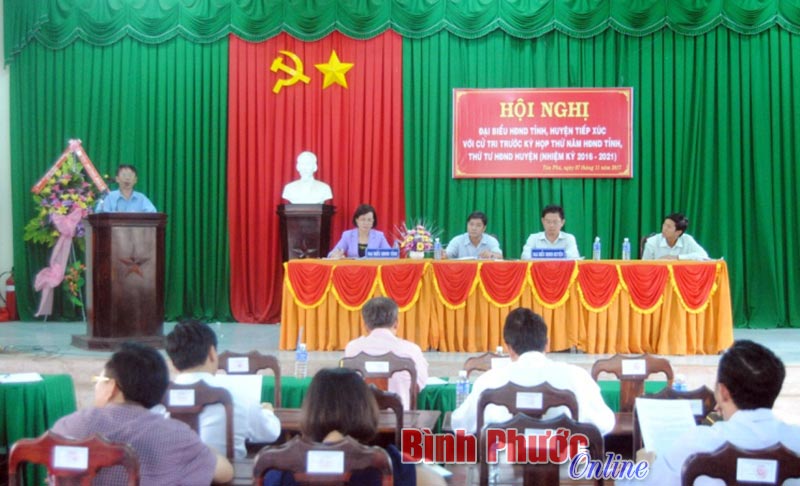BP - * Ngày 7-11, các đại biểu HĐND tỉnh: Trần Ngọc Trai, Ủy viên Ban Thường vụ Tỉnh ủy, Phó chủ tịch HĐND tỉnh; Trần Tuyết Minh Ủy viên Ban Thường vụ, Trưởng ban Tuyên giáo Tỉnh ủy và các đại biểu HĐND huyện Đồng Phú đã có buổi tiếp xúc cử tri xã Đồng Tâm, thị trấn Tân Phú trước kỳ họp thứ 5 HĐND tỉnh và kỳ họp thứ 4 HĐND huyện, nhiệm kỳ 2016-2021.