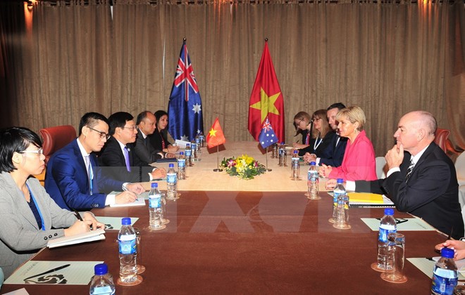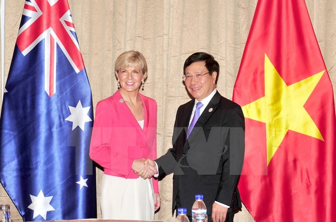 Phó Thủ tướng, Bộ trưởng Ngoại giao Phạm Bình Minh, Chủ tịch Ủy ban Quốc gia APEC 2017 hội kiến với bà Julie Bishop, Bộ trưởng Ngoại giao và Thương mại Australia. (Nguồn: TTXVN)