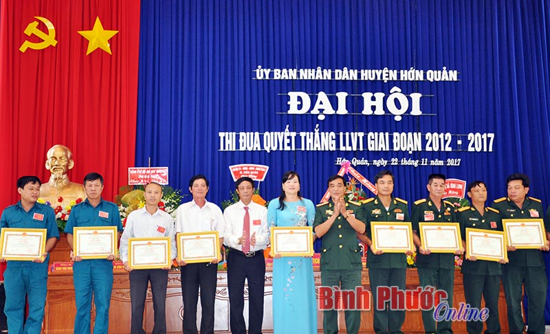 Lãnh đạo Bộ CHQS tỉnh và huyện Hớn Quản trao giấy khen cho các tập thể, cá nhân có thành tích xuất sắc trong phong trào thi đua quyết thắng giai đoạn 2012-2017