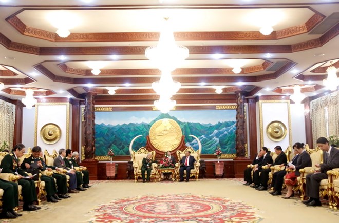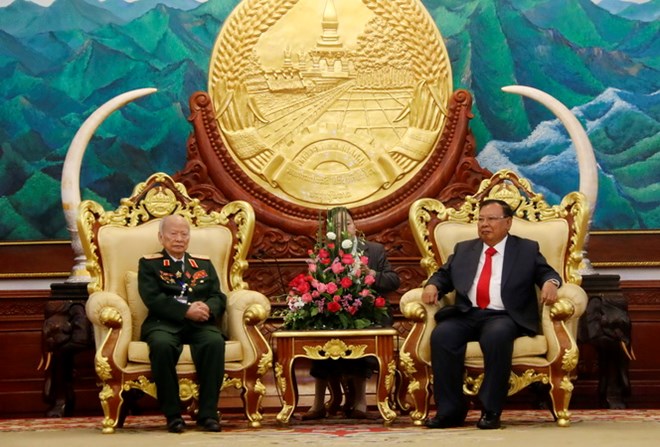 Tổng Bí thư, Chủ tịch Lào Bounnhang Volachith tiếp Thiếu tướng Huỳnh Đắc Hương, Trưởng đoàn. (Ảnh: Phạm Kiên/TTXVN)