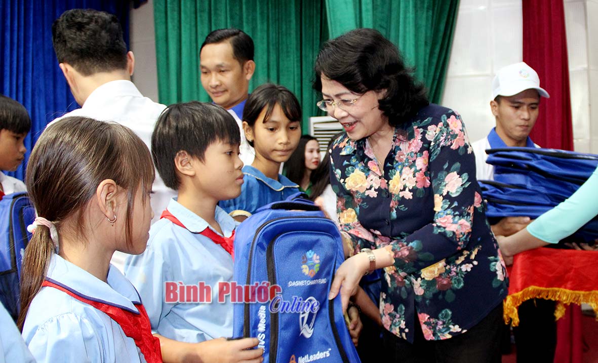Phó chủ tịch nước Đặng Thị Ngọc Thịnh trao 200 phần quà cho các em học sinh có hoàn cảnh khó khăn trên địa bàn tỉnh.