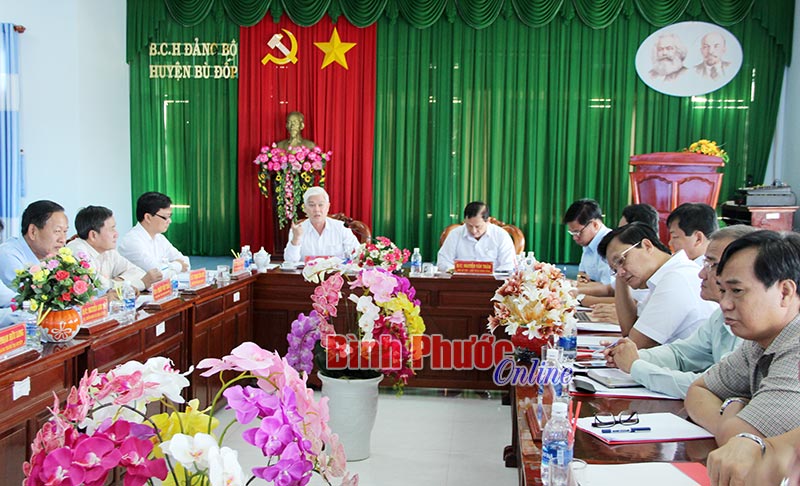 Báo cáo tại buổi làm việc, lãnh đạo huyện Bù Đốp kiến nghị 4 vấn đề: UBND tỉnh cho chủ trương tiếp tục đầu tư dự án nâng cấp, mở rộng đường Lộc Tấn - Hoàng Diệu đoạn từ trung tâm xã Thiện Hưng đến xã Hưng Phước, khoảng 2km. Ngành nông nghiệp khảo sát thực tế để có kế hoạch xây dựng các kênh nhánh phụ dẫn nước nhằm đáp ứng nhu cầu nước tưới của nhân dân vào mùa khô. Đề nghị Tập đoàn Công nghiệp cao su Việt Nam giao đất cho địa phương để xây dựng các công trình phúc lợi xã hội. Tỉnh xem xét, chấp thuận cho huyện sử dụng ngân sách kết dư để xây dựng nhà khách của Huyện ủy.