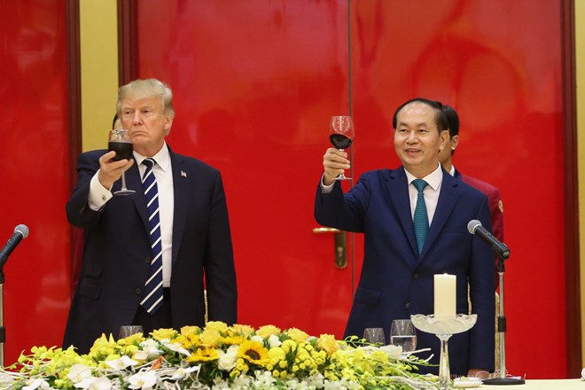 Chủ tịch nước Trần Đại Quang và Tổng thống Hoa Kỳ Donald Trump nâng ly chúc mừng mối quan hệ Việt Nam-Hoa Kỳ
