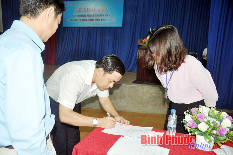 Tham dự kỳ thi lần này có 109 thí sinh, trong đó có 87 nam và 22 nữ; trình độ chuyên môn có 29 thạc sĩ, còn lại là cử nhân. Trong hai ngày 27 và 28-1, các thí sinh trải qua 4 bài thi, gồm kiến thức chung, trắc nghiệm chuyên ngành, tin học và ngoại ngữ. Năm 2017 tỉnh Bình Phước được phân bổ 100 chỉ tiêu, kết quả sẽ lấy từ cao xuống thấp đến đủ chỉ tiêu nâng ngạch.