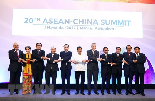 Thủ tướng Nguyễn Xuân Phúc (thứ tư từ trái sang), Thủ tướng Trung Quốc Lý Khắc Cường (thứ năm từ trái sang) và các Trưởng đoàn ASEAN chụp ảnh chung tại Hội nghị Cấp cao ASEAN-Trung Quốc lần thứ 20