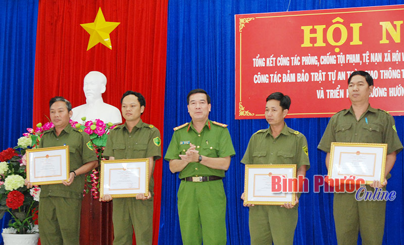 Đại tá Bùi Xuân Thắng, Phó giám đốc Công an tỉnh tặng giấy khen của Công an tỉnh cho các tập thể, cá nhân có thành tích xuất sắc trong xây dựng phong trào Toàn dân bảo vệ an ninh Tổ quốc