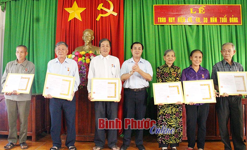 Huy hiệu 45 năm tuổi Đảng trao tặng 4 đảng viên: Lương Kim Quyết, Nguyễn Đình, Hoàng Thị Tý, Nguyễn Thị Diệp. Huy hiệu 40 năm tuổi Đảng trao tặng đảng viên Đặng Quốc Khánh và Huy hiệu 30 năm tuổi Đảng trao tặng đồng chí Dương Văn Mai.