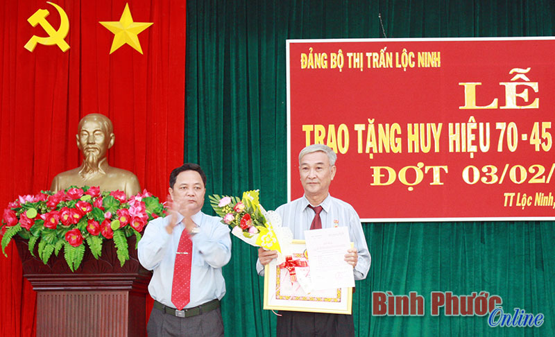 Tại buổi lễ, thừa ủy quyền của Ban Thường vụ Huyện ủy, đồng chí Nguyễn Tiến Cường, Phó bí thư Thường trực Huyện ủy, Chủ tịch HĐND huyện đã trao quyết định tặng Huy hiệu 70 năm tuổi Đảng cho đảng viên Hoàng Giang, sinh năm 1928, quê quán xã Đồng Sơn, huyện Yên Thế, tỉnh Bắc Giang, vào Đảng chính thức ngày 20-6-1949; trao Huy hiệu 45 năm tuổi Đảng tặng đảng viên Lại Tiến Chức, sinh năm 1950, quê quán xã Nghĩa Thành, huyện Nghĩa Hưng, tỉnh Nam Định, vào Đảng chính thức ngày 5-10-1973, cùng sinh hoạt tại Đảng bộ thị trấn Lộc Ninh.
