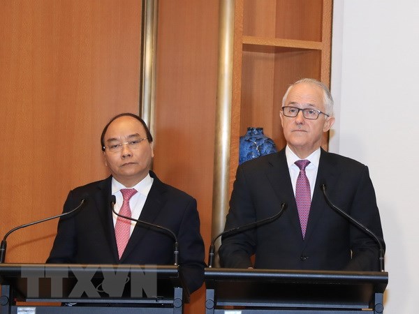 Thủ tướng Nguyễn Xuân Phúc và Thủ tướng Australia Malcolm Turnbull gặp gỡ báo chí sau Lễ đón chính thức và hội đàm