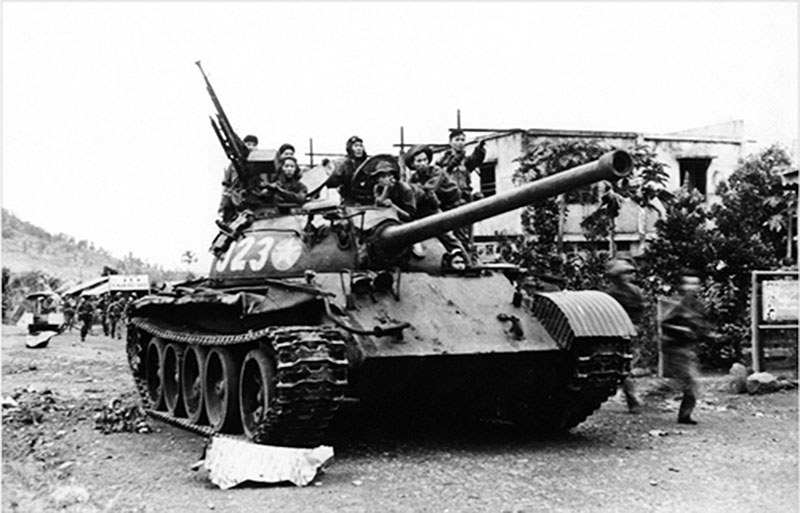Xe tăng trong đội hình Đại đội Tăng 10 do Đại đội trưởng Nguyễn Văn Thành chỉ huy cùng bộ binh tấn công vào dinh Tỉnh trưởng Phước Long ngày 6-1-1975 - Ảnh tư liệu
