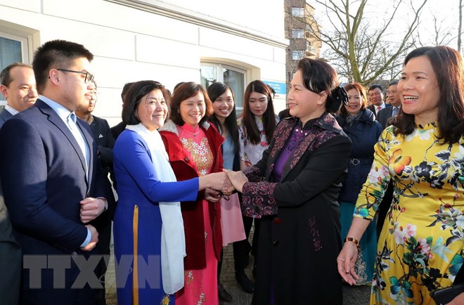 Cán bộ, nhân viên Đại sứ quán và bà con Việt kiều đón Chủ tịch Quốc hội Nguyễn Thị Kim Ngân