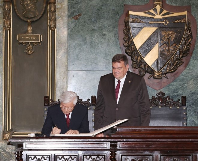 Tổng Bí thư Nguyễn Phú Trọng ghi sổ lưu bút tại trường Đại học Tổng hợp La Habana