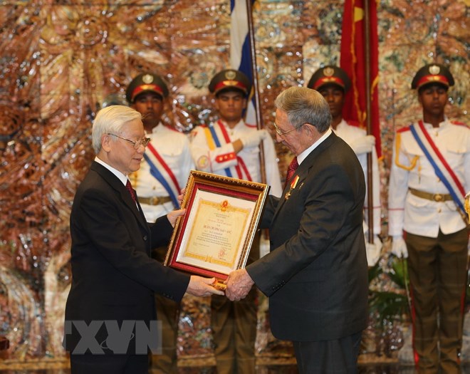 Tổng Bí thư Nguyễn Phú Trọng trao tặng Huân chương Sao Vàng cho Bí thư Thứ nhất Ban chấp hành Trung ương Đảng Cộng sản Cuba, Chủ tịch Hội đồng Nhà nước và Hội đồng Bộ trưởng Cộng hòa Cuba Raul Castro Ruz