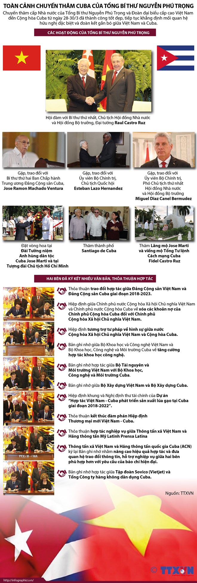 BPO - Chuyến thăm cấp Nhà nước của Tổng Bí thư Nguyễn Phú Trọng và Đoàn đại biểu cấp cao Việt Nam đến Cộng hòa Cuba từ ngày 28 đến 30-3 đã thành công tốt đẹp, tiếp tục khẳng định mối quan hệ hữu nghị đặc biệt và đoàn kết gắn bó giữa Việt Nam và Cuba.