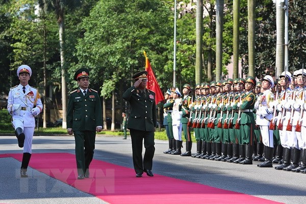 Thượng tướng Phan Văn Giang và Thượng tướng Suvon Luongbunmi duyệt đội danh dự.