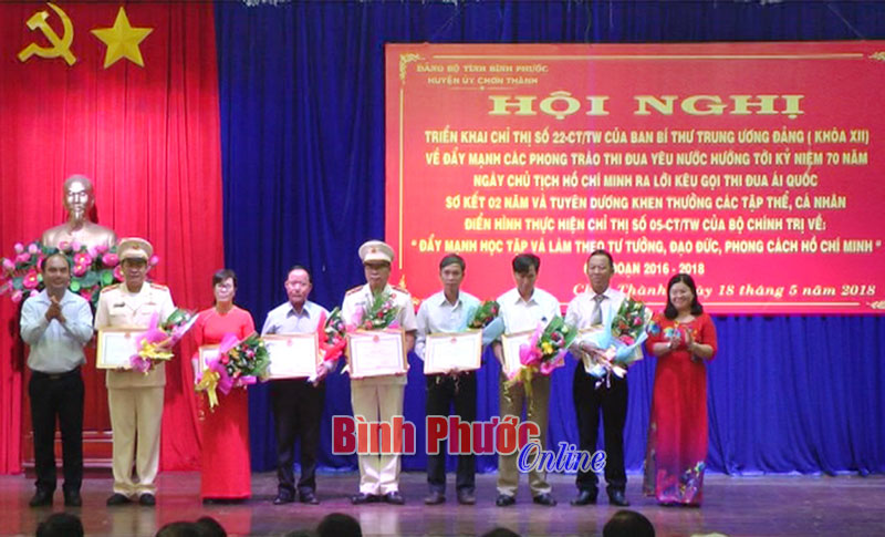 * Ngày 18-5, Huyện ủy Chơn Thành tổ chức tuyên dương 7 thể và 15 cá nhân điển hình thực hiện Chỉ thị 05 CT/TW của Bộ Chính trị về đẩy mạnh học tập và làm theo tư tưởng, đạo đức, phong cách Hồ Chí Minh.