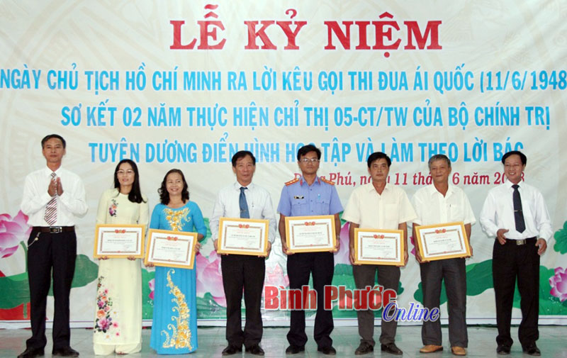 Tại lễ kỷ niệm, Huyện ủy Đồng Phú đã tuyên dương 13 tập thể, 29 cá nhân điển hình trong học tập và làm theo Bác giai đoạn 2016-2018; đồng thời trao 11 giải thưởng cho các cá nhân có bài viết xuất sắc tại cuộc thi viết về chủ đề “Học tập và làm theo tư tưởng, đạo đức, phong cách Hồ Chí Minh”.