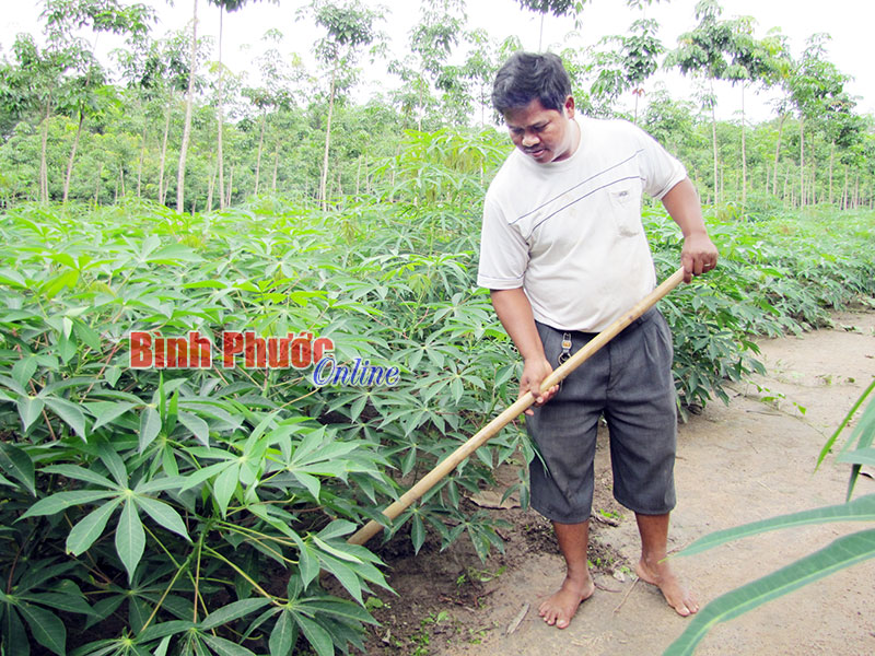 Hội nông dân tích cực làm tốt dân vận ở cơ sở, trong đó tuyên truyền hội viên phát triển nông nghiệp bền vững. Trong ảnh: Đồng bào dân tộc thiểu số ấp Bưng Sê, xã Tân Thành (Đồng Xoài) trồng xen canh mì trong vườn cao su để tăng thu nhập