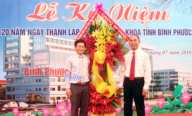 Thay mặt Tỉnh ủy, HĐND, UBND, UBMTTQVN tỉnh, Phó chủ tịch UBND tỉnh Nguyễn Tiến Dũng tặng lẵng hoa chúc mừng bệnh viện nhân 20 năm ngày thành lập