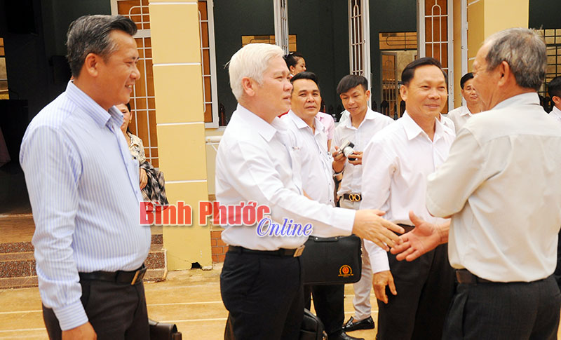 Bí thư Tỉnh ủy, Trưởng đoàn Đại biểu Quốc hội tỉnh Nguyễn Văn Lợi thăm hỏi và chia sẻ với cử tri là cán bộ hưu trí của xã Đức Hạnh sau buổi tiếp xúc.