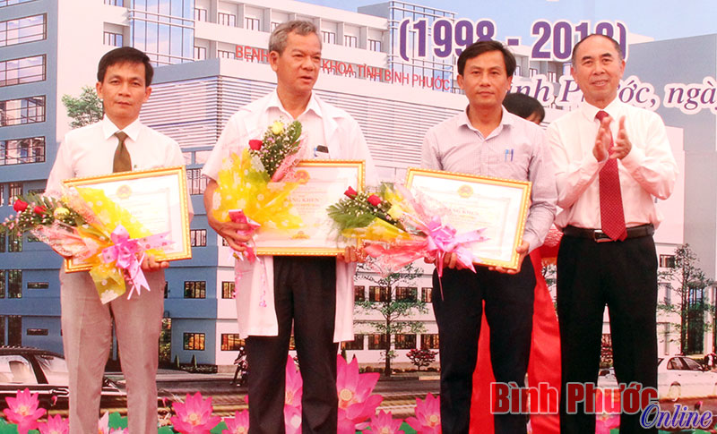 Phó chủ tịch UBND tỉnh Nguyễn Tiến Dũng trao bằng khen của UBND tỉnh tặng các bác sĩ có thành tích xuất sắc dịp kỷ niệm 20 năm thành lập Bệnh viện đa khoa tỉnh