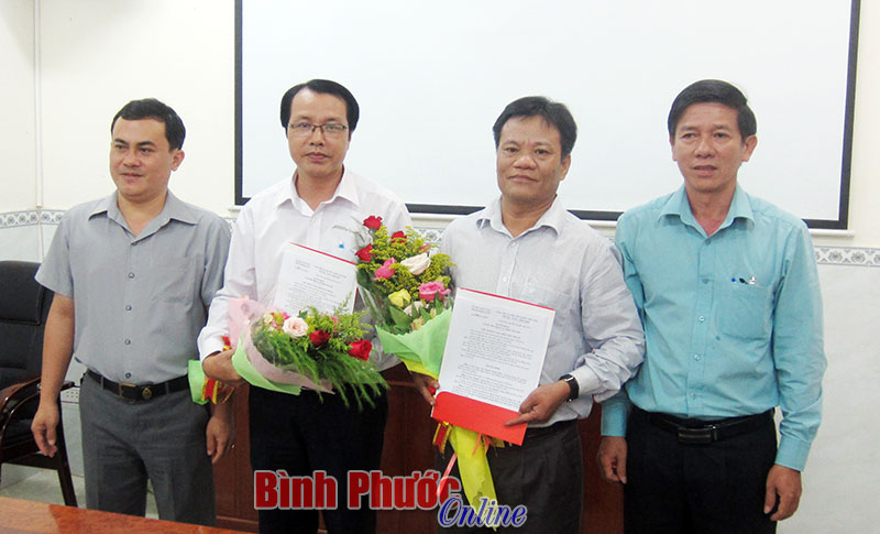 Chủ tịch UBND thị xã Đồng Xoài Lê Trường Sơn và Trưởng ban Tổ chức thị ủy Nguyễn Hữu Hiền trao quyết định và tặng hoa cho 2 trưởng phòng