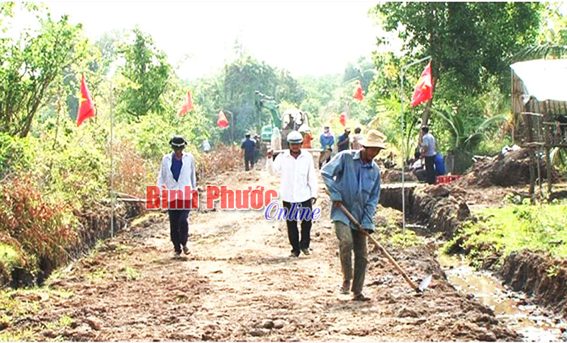 Đồng bào dân tộc thiểu số ở ấp Sóc Lớn, xã Lộc Khánh (Lộc Ninh) tích cực đóng góp ngày công làm đường giao thông nông thôn