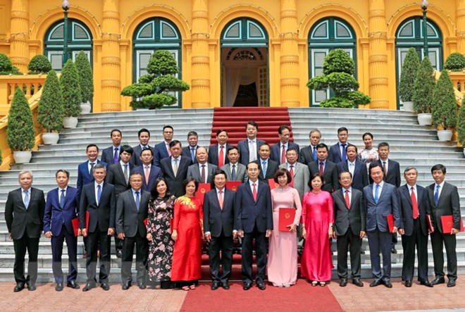 Thay mặt lãnh đạo Đảng, Nhà nước, Chủ tịch nước Trần Đại Quang đã dự và trao Quyết định cho các Đại sứ.