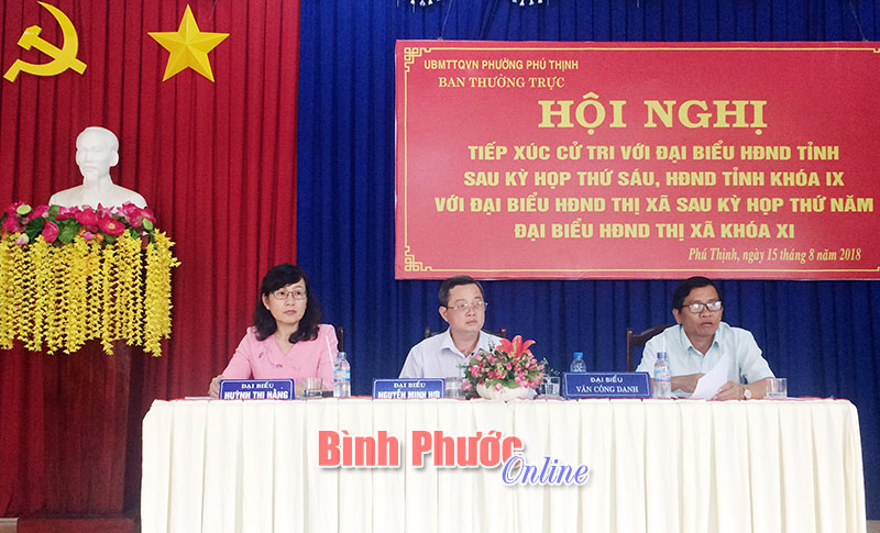Sau khi nghe các đại biểu HĐND 2 cấp thông báo nhanh kết quả kỳ họp thứ 6, HĐND tỉnh và kỳ họp thứ 5, HĐND thị xã, cử tri phường Phú Thịnh đã có 8 ý kiến, kiến nghị. Cụ thể: Việc giải quyết tranh chấp đất đai trong nhân dân quá chậm; một số chế độ cho người tham gia cách mạng, người có công chưa phù hợp; xe quá khổ, quá tải chở vật liệu xây dựng gây hư hỏng đường và làm rơi đá tiềm ẩn nguy cơ tai nạn giao thông; đường Nơ Trang Long tại khu phố Phú Xuân bị đọng nước mỗi khi trời mưa gây khó khăn cho người dân trong khi lưu thông; cần xử lý triệt để tình trạng lấn chiếm lòng, lề đường Hùng Vương buôn bán; cần đầu tư xây dựng một số tuyến đường giao thông trên địa bàn phường để thúc đẩy phát triển kinh tế - xã hội...