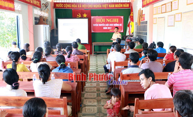 Đội cảnh sát giao thông Công an thị xã Phước Long tuyên truyền về an toàn giao thông cho đồng bào dân tộc thiểu số tại thôn 7, xã Long Giang