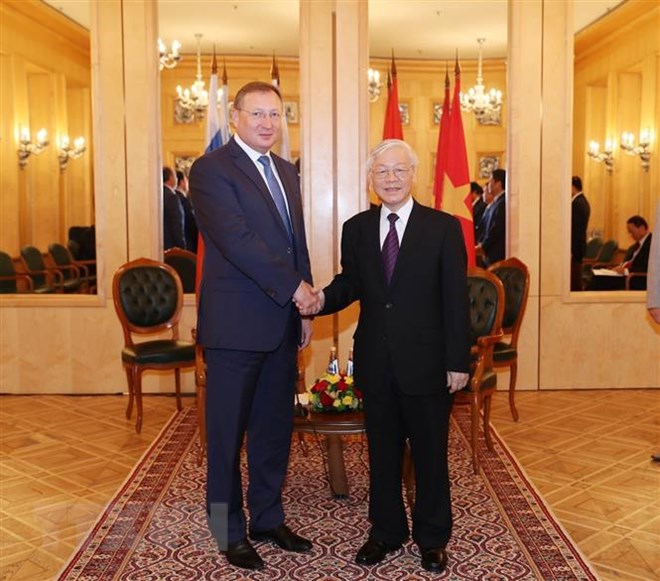 Tổng Bí thư hoan nghênh các Tập đoàn kiên trì thực hiện hiệu quả các hợp đồng hợp tác đã ký kết, đồng thời tiếp tục tăng cường các hoạt động hợp tác tại Việt Nam; khẳng định Việt Nam sẽ tạo điều kiện thuận lợi nhất cho các doanh nghiệp Nga, trong đó có các tập đoàn trên mở rộng quy mô hợp tác giữa hai bên; tin tưởng các dự án hợp tác giữa hai bên sẽ đạt được kết quả mong đợi, mang lại hiệu quả kinh tế, phục vụ lợi ích chung của cả hai quốc gia.