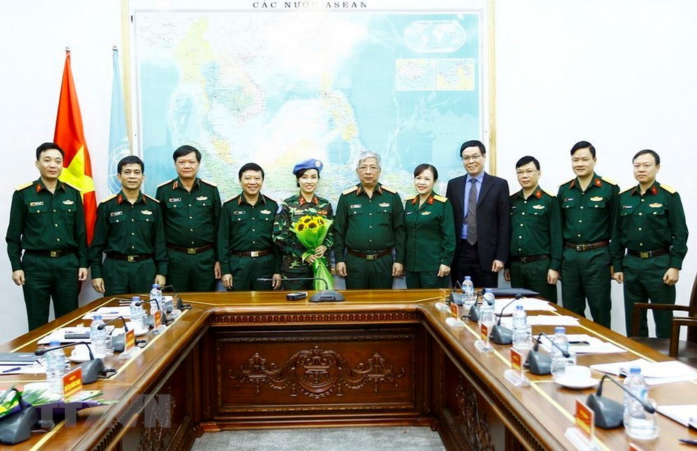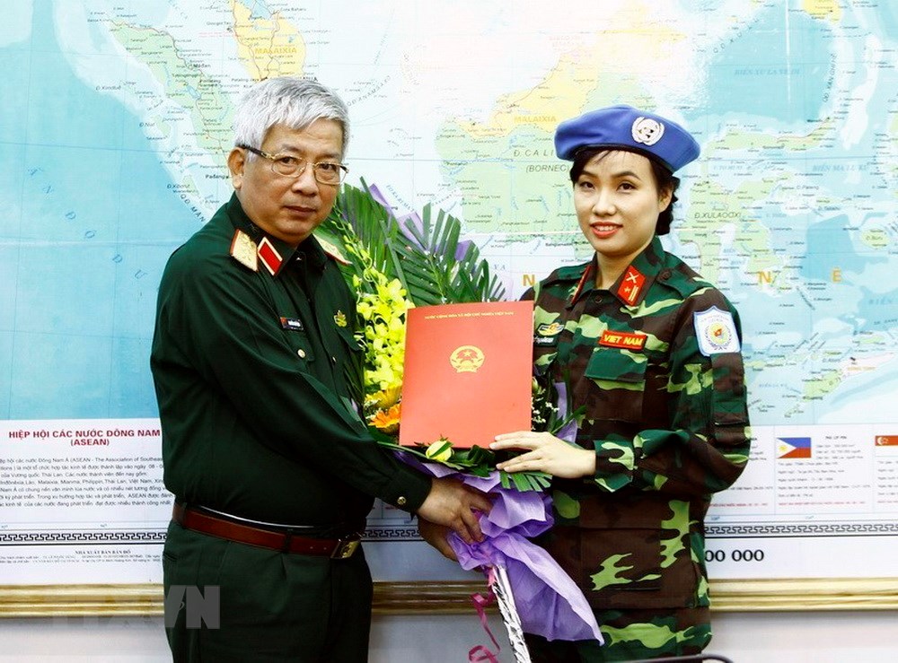 Thượng tướng Nguyễn Chí Vịnh, Ủy viên Trung ương Đảng, Ủy viên Thường vụ Quân ủy Trung ương, Thứ trưởng Bộ Quốc phòng trao Quyết định của Chủ tịch nước cho Thiếu tá Đỗ Thị Hằng Nga, Trợ lý Phòng Tham mưu - Kế hoạch thuộc Trung tâm Gìn giữ hòa bình Việt Nam đi làm nhiệm vụ tại phái bộ GGHB Liên hợp quốc ở Nam Sudan, sáng 30-10-2017, tại Hà Nội.