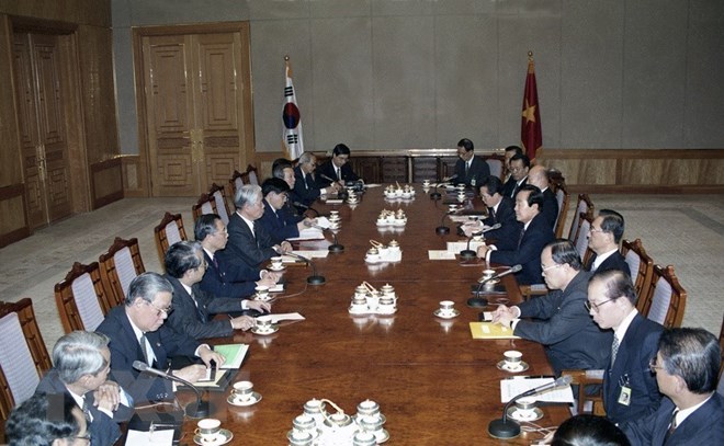 Tổng thống Hàn Quốc Kim Young-sam hội đàm với Tổng Bí thư Đỗ Mười tại thủ đô Seoul, Hàn Quốc (4-1995). (Ảnh: Xuân Lâm-TTXVN)
