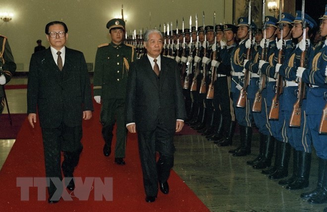 Tổng Bí thư Đảng Cộng sản Trung Quốc Giang Trạch Dân hội đàm với Tổng Bí thư Đỗ Mười, sáng 6-11-1991 tại Bắc Kinh, trong chuyến thăm Trung Quốc. Tại chuyến thăm này, hai nước tuyên bố 'khép lại quá khứ, mở ra tương lai,' thực hiện bình thường hóa quan hệ giữa hai Đảng và hai Nhà nước