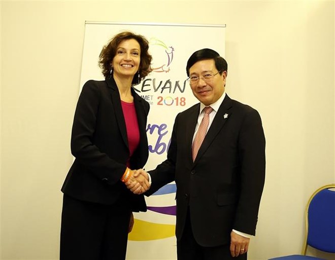 Tiếp Tổng Giám đốc Tổ chức Văn hoá Giáo dục của Liên hợp quốc (UNESCO) bà Audrey Azoulay, Phó Thủ tướng Bộ trưởng Phạm Bình Minh đánh giá cao sự hợp tác và hỗ trợ của UNESCO đối với Việt Nam những năm qua và bày tỏ mong muốn bà Tổng Giám đốc trên cương vị của mình tiếp tục ủng hộ Việt Nam.