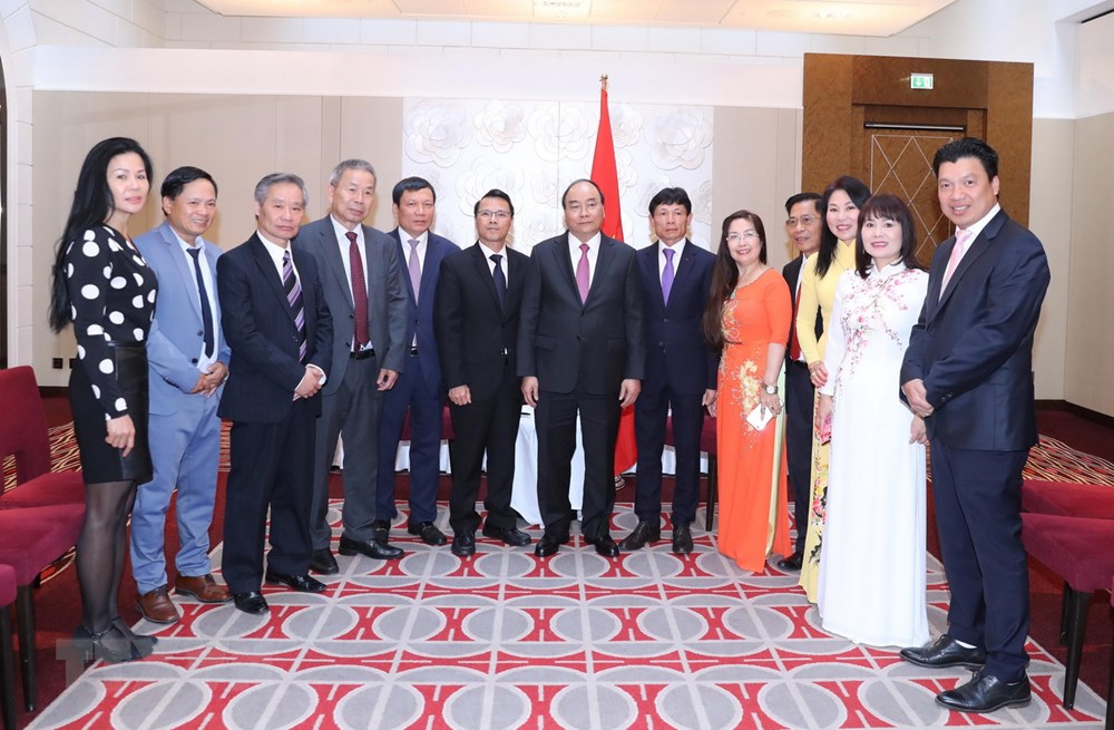 Thủ tướng Nguyễn Xuân Phúc, Chủ tịch Hội người Việt Nam tại Cộng hòa Czech Nguyễn Duy Nhiên, Chủ tịch Liên hiệp Hội người Việt Nam tại châu Âu Hoàng Đình Thắng và các đại biểu chụp ảnh chung.