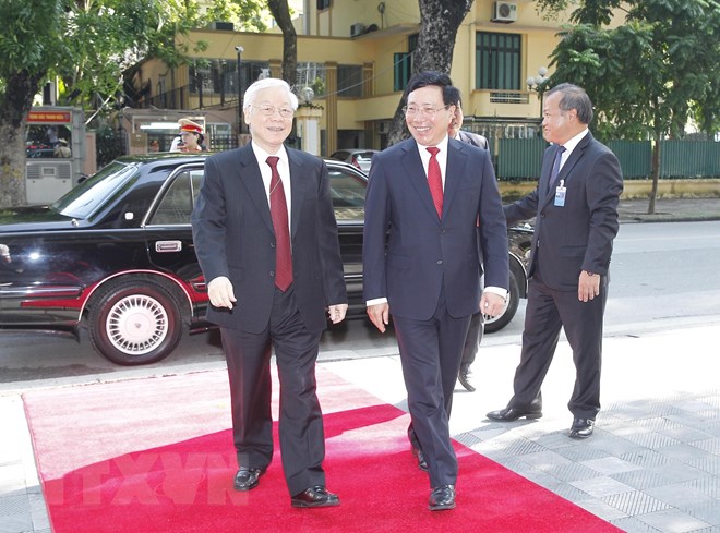 Phó Thủ tướng, Bộ trưởng Bộ Ngoại giao Phạm Bình Minh đón Tổng Bí thư Nguyễn Phú Trọng đến dự Hội nghị Ngoại giao lần thứ 30 (8-2018)