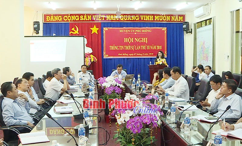 Năm 2018, Ban Tuyên giáo Huyện ủy Phú Riềng tham mưu Huyện ủy tổ chức thành công 5 hội nghị thông tin thời sự với hơn 6.000 lượt cán bộ, đảng viên tham gia. Đáng nói, dù còn rất nhiều khó khăn nhưng từ tháng 4-2018, ban đã tham mưu Huyện ủy, UBND huyện trang bị phòng họp trực tuyến tổ chức học tập nghị quyết và thông tin thời sự từ điểm cầu Huyện ủy tới 12 điểm cầu của 10 xã và cơ quan công an, quân sự huyện. Từ tháng 4 đến nay, tất cả hội nghị thông tin thời sự, triển khai nghị quyết của các cấp ủy đảng đều được tổ chức trực tuyến.