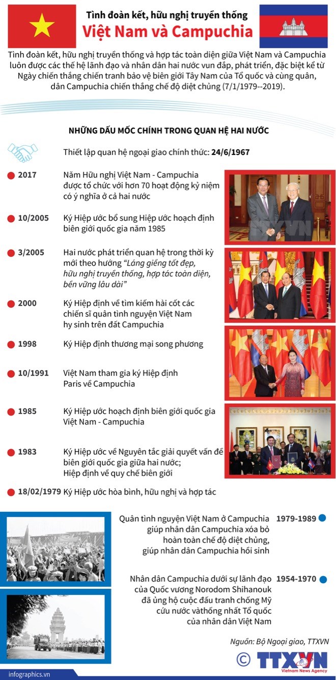 BPO - Tình đoàn kết, hữu nghị truyền thống và hợp tác toàn diện giữa Việt Nam và Campuchia luôn được các thế hệ lãnh đạo và nhân dân hai nước vun đắp, phát triển, đặc biệt kể từ Ngày chiến thắng chiến tranh bảo vệ biên giới Tây Nam của Tổ quốc và cùng quân, dân Campuchia chiến thắng chế độ diệt chủng (7-1-1979-7-1-2019).