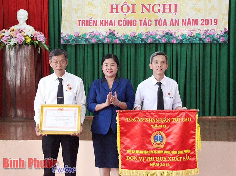 Đồng chí Trần Tuệ Hiền, Phó bí thư Thường trực Tỉnh ủy, Chủ tịch HĐND tỉnh trao các danh hiệu của Tòa án nhân dân tối cao cho những tập thể, cá nhân hoàn thành xuất sắc nhiệm vụ năm 2018