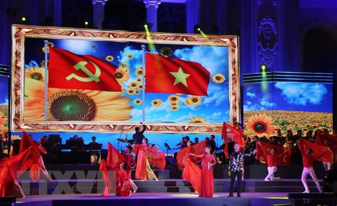 Tiết mục biểu diễn nghệ thuật kỷ niệm 89 năm Ngày thành lập Đảng Cộng sản Việt Nam. (Ảnh: Xuân Dự/TTXVN)