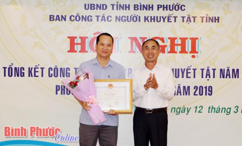 Phó chủ tịch UBND tỉnh Nguyễn Tiến Dũng tặng bằng khen của UBND tỉnh cho ông Bùi Văn Toàn, Giám đốc Hội trợ giúp người khuyết tật Việt Nam