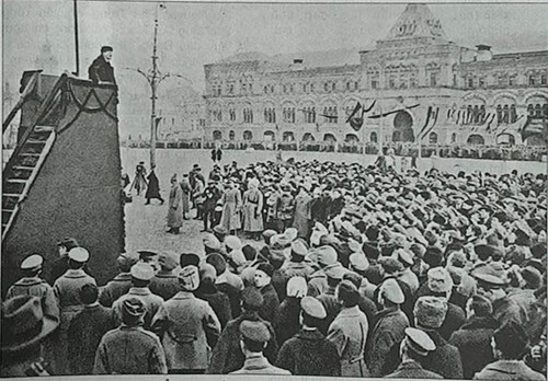 Lãnh tụ V.I.Lenin phát biểu tại Quảng trường Đỏ nhân kỷ niệm một năm Cách mạng Tháng Mười Nga vĩ đại. Ảnh: Topwar.ru