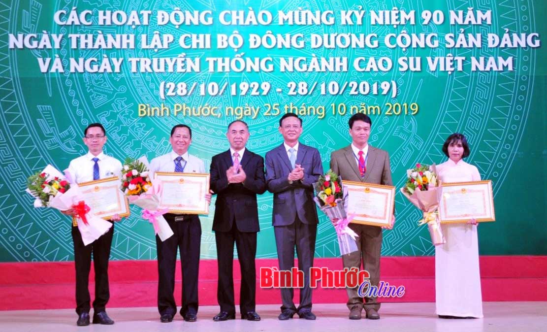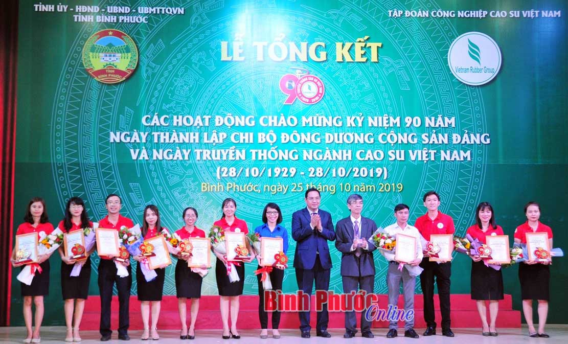 Cũng trong chiều 25-10, tại Công ty cổ phần cao su Đồng Phú, Tỉnh ủy, HĐND, UBND, UBMTTQVN tỉnh Bình Phước và Tập đoàn Công nghiệp cao su Việt Nam phối hợp tổ chức tổng kết các hoạt động chào mừng kỷ niệm 90 năm Ngày thành lập chi bộ Đông Dương cộng sản Đảng và ngày truyền thống ngành cao su Việt nam (28-10-1929 -28-10-2019).