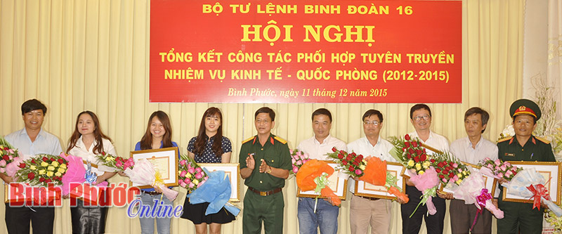 Đại tá Hà Huy Tân trao tặng bằng khen của Bộ Tư lệnh Binh đoàn 16 cho các tập thể làm tốt công tác phối hợp tuyên truyền giai đoạn 2012-2015 - Ảnh: Vũ Thuyên