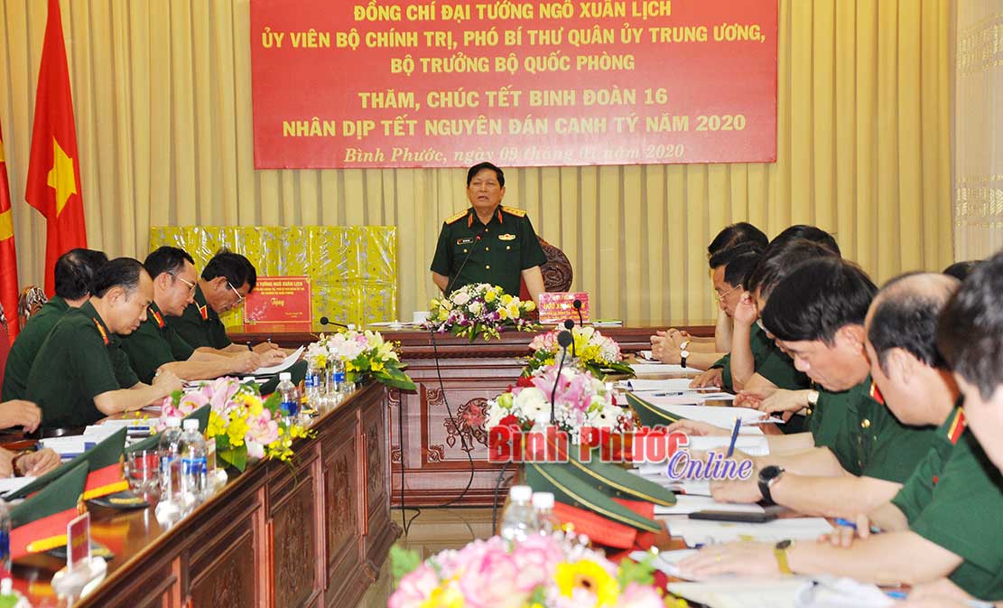 Nằm trong chương trình công tác, đoàn đã đến thăm và chúc tết cán bộ, chiến sĩ Binh đoàn 16. Tại đây, Đại tướng Ngô Xuân Lịch đã tặng quà tết cho Mẹ Việt Nam anh hùng Trần Thị Bảy, các già làng, gia đình chính sách và cán bộ, chiến sĩ binh đoàn.
